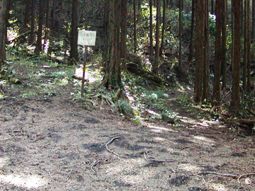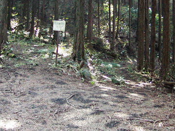 | (19)近野山から登山道に合流-振り返って撮影(立体写真) 左方向から下ってきました。登山道は右へ伸びています。 金比羅社のある場所から東尾根へ下ろうと、道らしき踏跡を進むと南側へカーブしていました。このままでは洒水の滝のある沢筋に下ってしまうと思い、途中で引き返すことにしました。他に杣道があるかもしれないと、山頂周辺を探したのですが見つからず、あきらめて東尾根を下ることにしました。結論として南へカーブした道は間もなく、南斜面から東へ伸びる杣道と合流し、沢へ下ることはありませんでした。 |