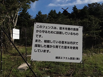 これも建物および電波塔に所有者等の表記がなく、苗木をシカから守るためのフェンスに取り付けられていた看板が唯一でした。 |