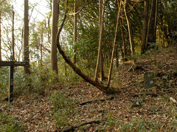16 墓石? 何か遺構はないかと注意深く尾根を南下していると、加工された石がありました。延宝四〜と読めます。西暦1676年のことのようです。もう江戸時代に入っているので、城郭とは関係なさそうです。 |