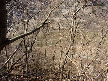 西の尾根を進み、北側の斜面を覗くと雛段状の地形がありました。当時の遺構なのか、後の時代の段々畑跡なのか... |