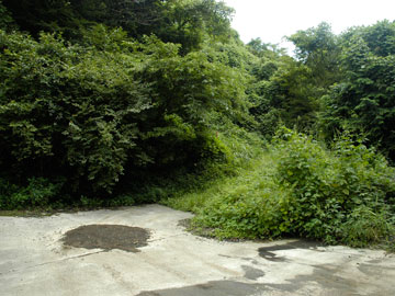 ある箇所では山側からしみ出した水が道路上を川のように流れ、路面の半分が流出していました。とても車両が通れる状態になく、何年も使用されていないようでした。 |