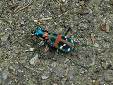 マムシを見てからといもの、路上に落ちている細長いものが蛇に見えてきます。そんな中、きれいな色をした虫が。子供のころ読んだ「昆虫のひみつ」に出てきたハンミョウのことを思い出しました。これを見たのも初めて。 |