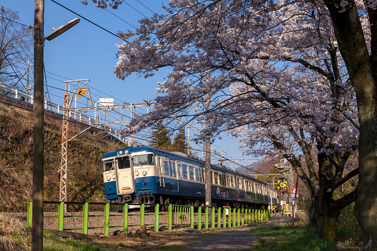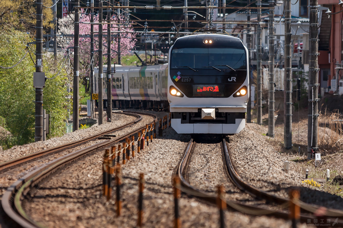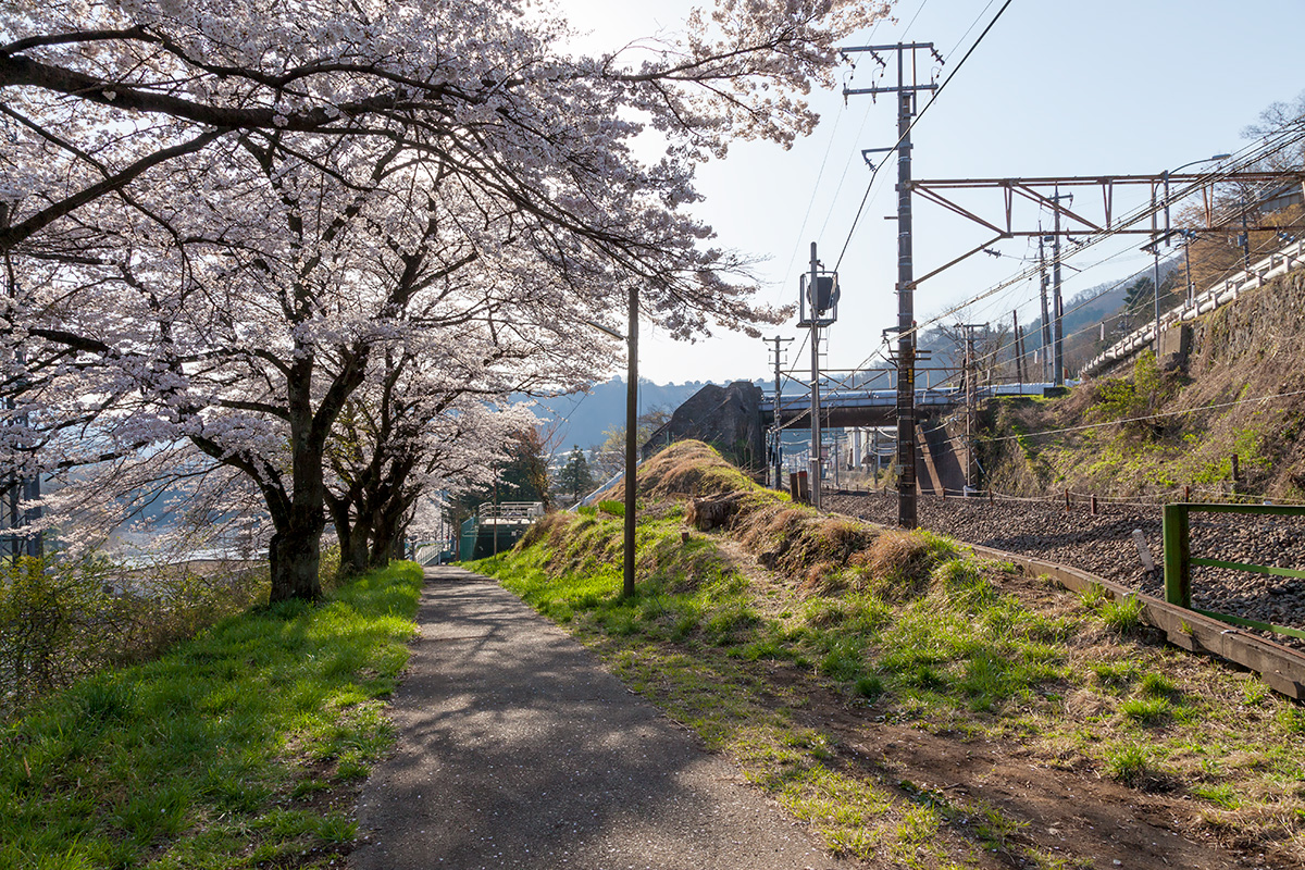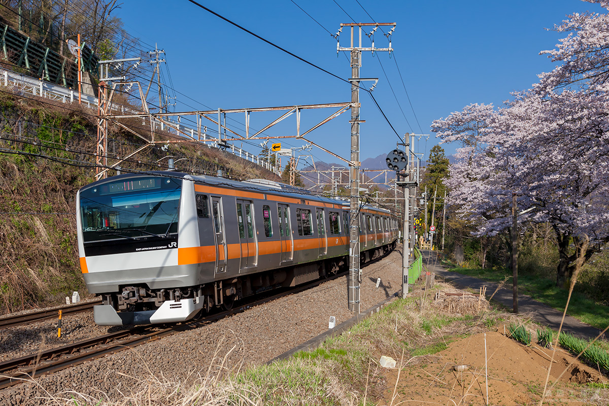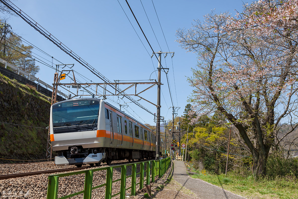 岩殿山からパノラマ撮影していたときに、遠望した中央本線沿いに満開の桜並木を見つけ、翌年訪れてみたのがここ、第五甲州街道踏切である。