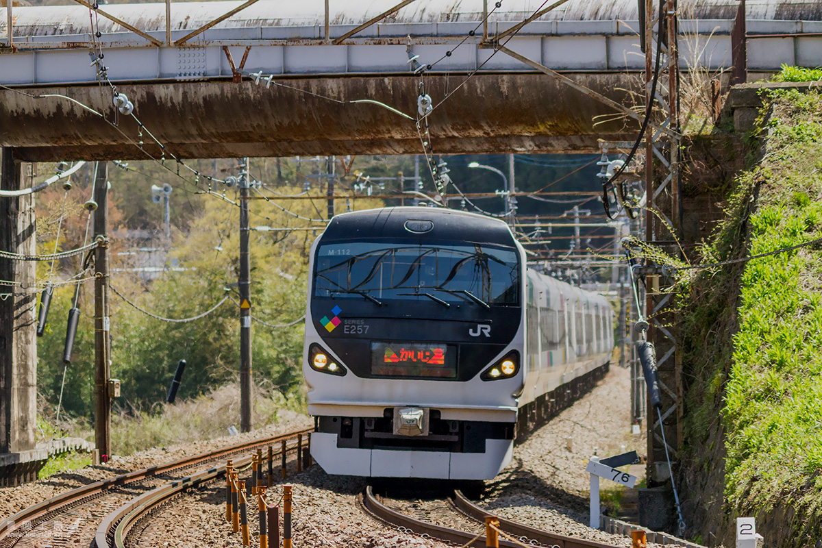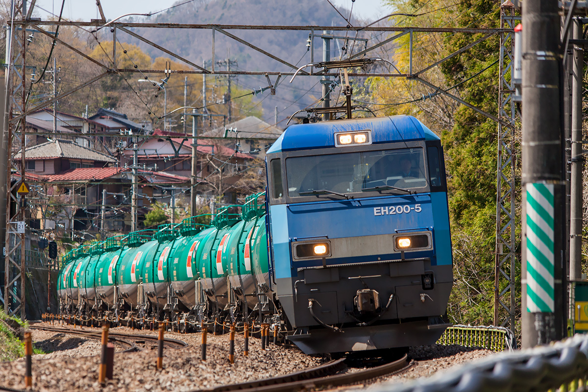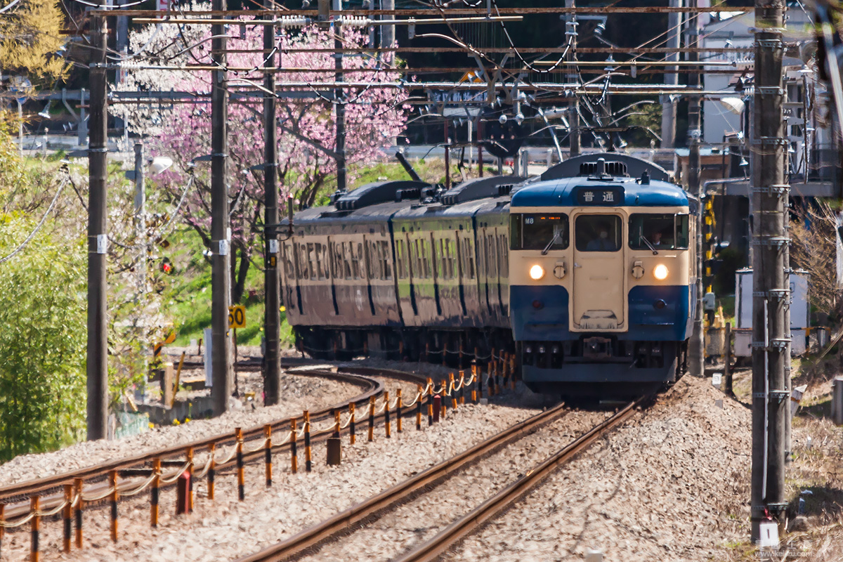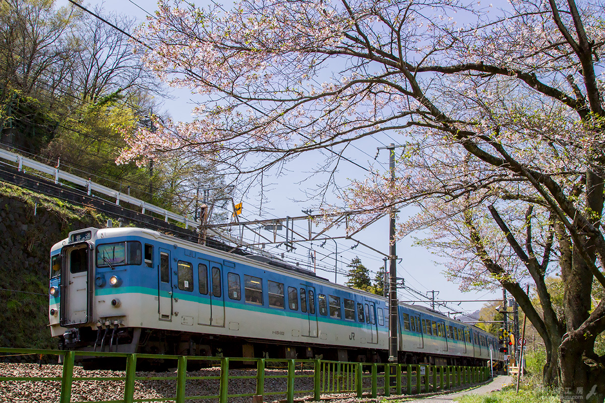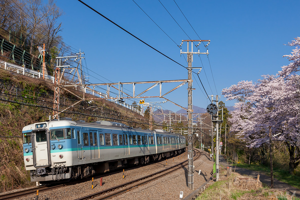 岩殿山からパノラマ撮影していたときに、遠望した中央本線沿いに満開の桜並木を見つけ、翌年訪れてみたのがここ、第五甲州街道踏切である。