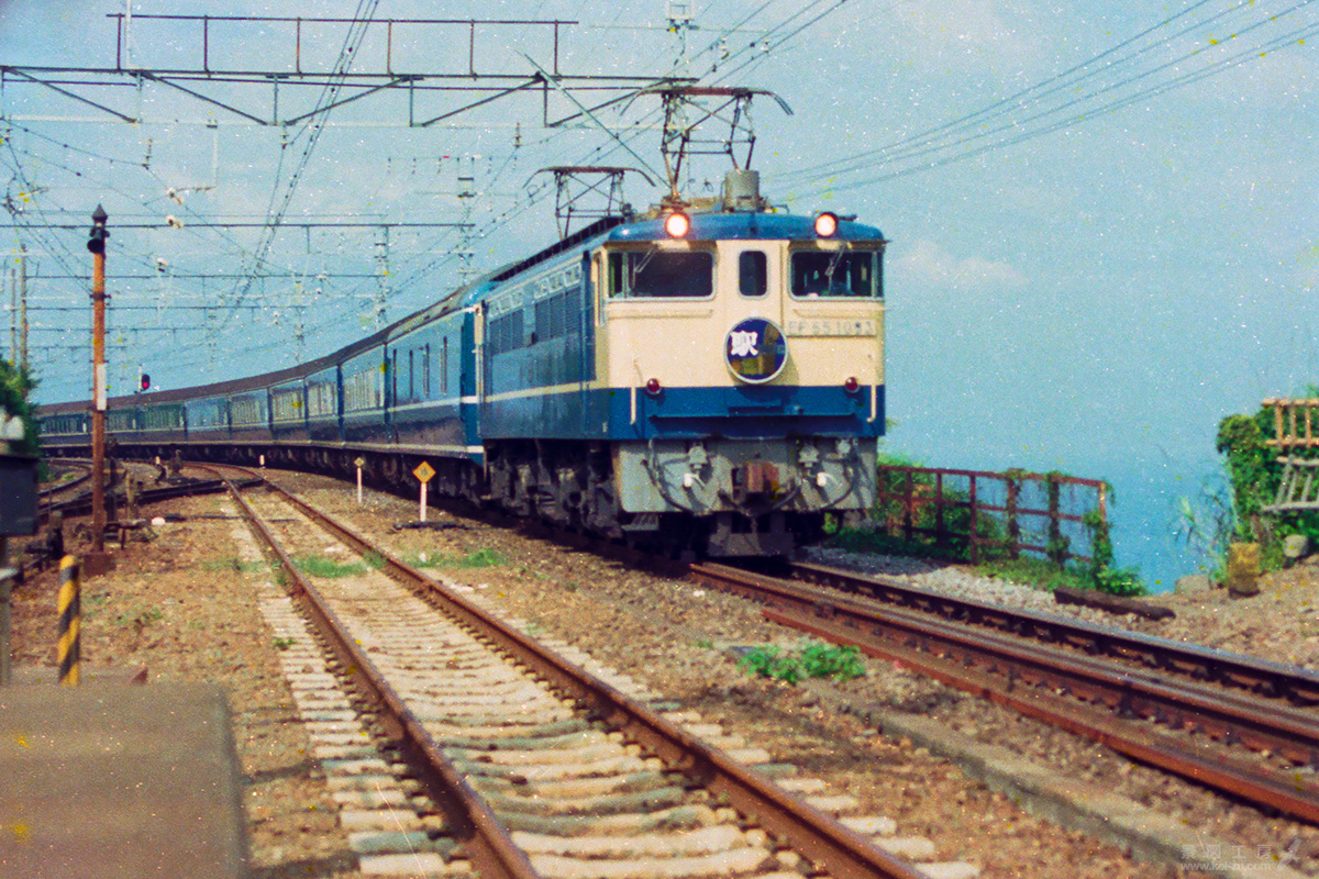 牽引機はEF65 1096。ナンバープレートの数字9の位置の黒い点はフィルム上のゴミかと思っていたところ、他所様のWebページにも同様の汚れが見つかった。