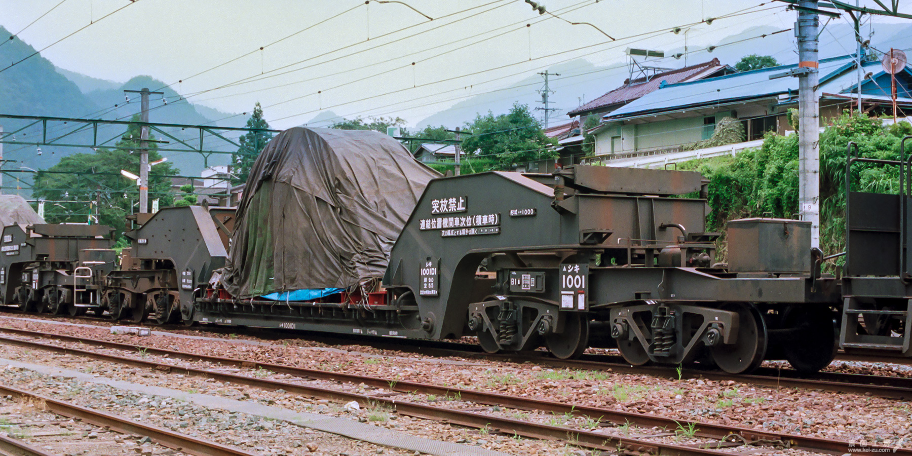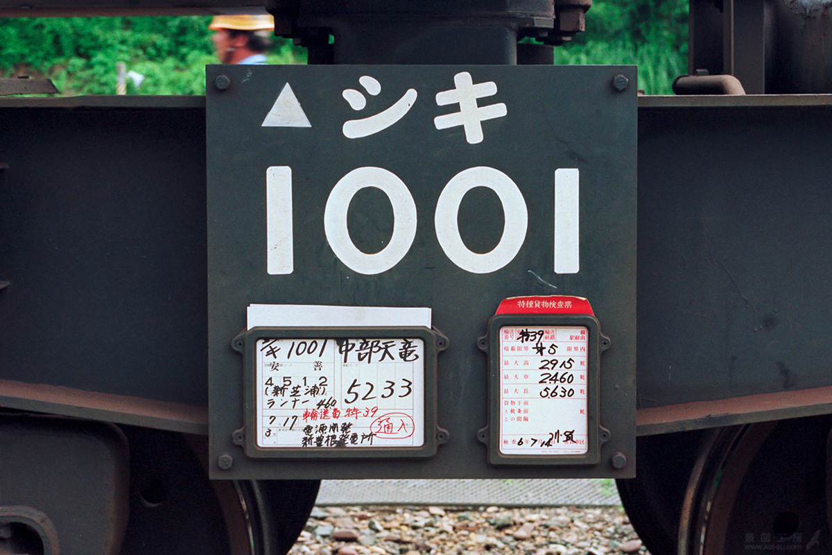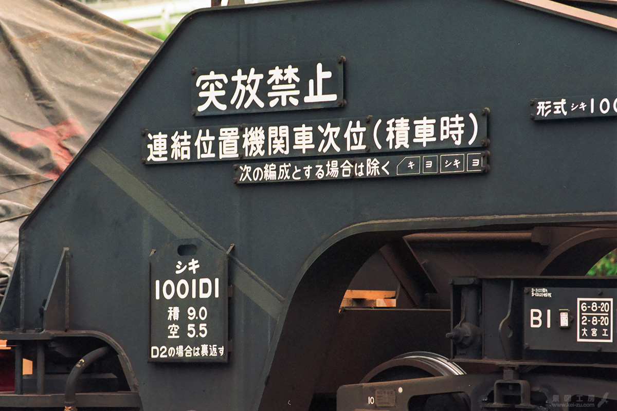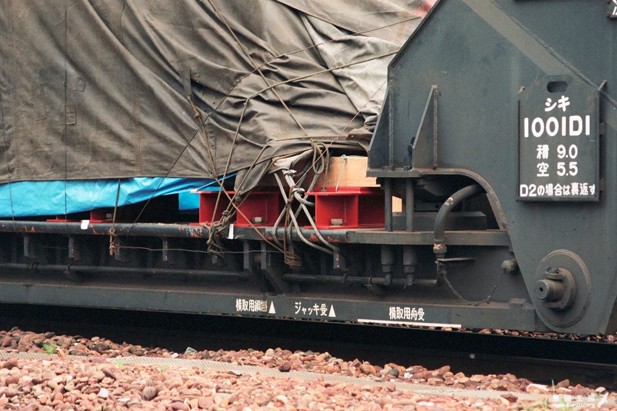元日本通運所有のシキ1000はのちに国鉄に買い上げられ、JRへと引き継がれた。そのため側面に社章はなく、台車上枠に記載された形式には、JRへ社籍が引き継がれたしるしの ▲シキ1000とある。この当時の常備駅は川島駅。