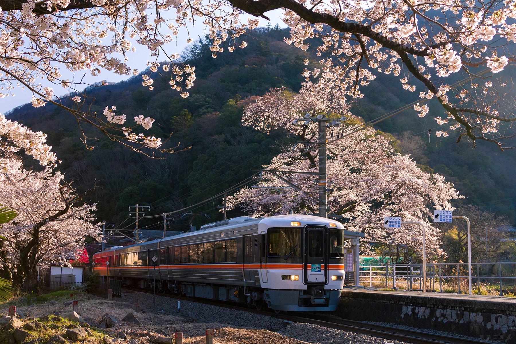 ホームの裏手にある桜の木を正面から撮ろうと三脚をセットしていると、予定時刻ではないのに踏切の警報が鳴り始めた。 特急ふじかわが大幅に遅延したのだろうか?と思っていたところ、やってきたのは検測車であった。
