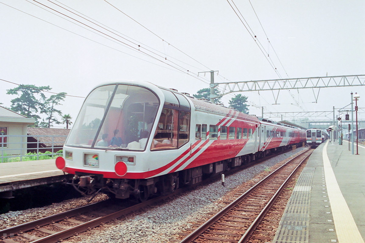 スーパーエクスプレスレインボーは昭和62(1987)年に14系客車から改造されたジョイフル・トレインと呼ばれる車輌で、斬新なチェリーレッドの車体が目を惹いた。