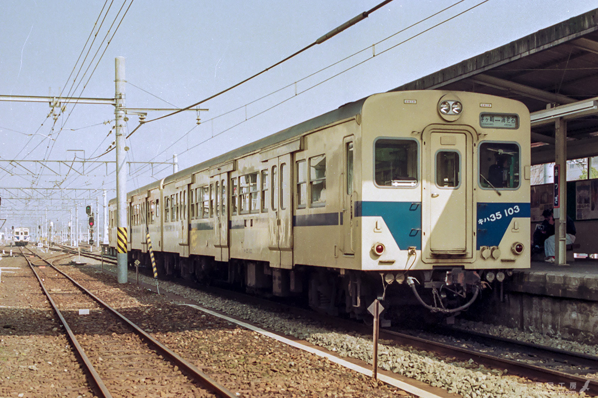 1981年6月撮影の茅ヶ崎機関区(現茅ヶ崎運輸区)である。 この当時のキハ35系は首都圏色、通称たらこ色であったことが伺える。 注視してみると、機関車はDD13、さらに奥の方には2重屋根で3軸ボギー客車のスエ38-7まで写っていた。