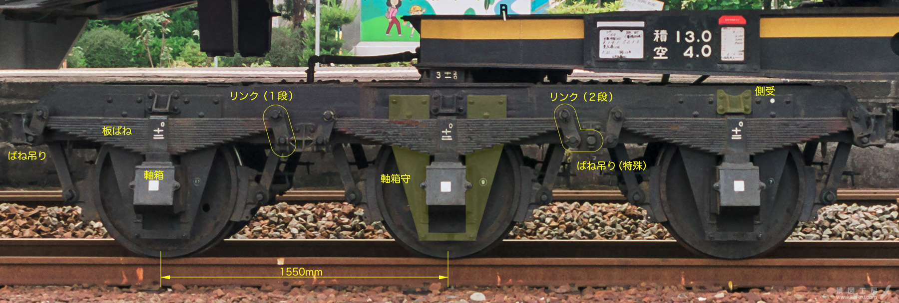 代表的な車輌であるトキ900形の軸間距離はそれぞれ2750mmであったが、板