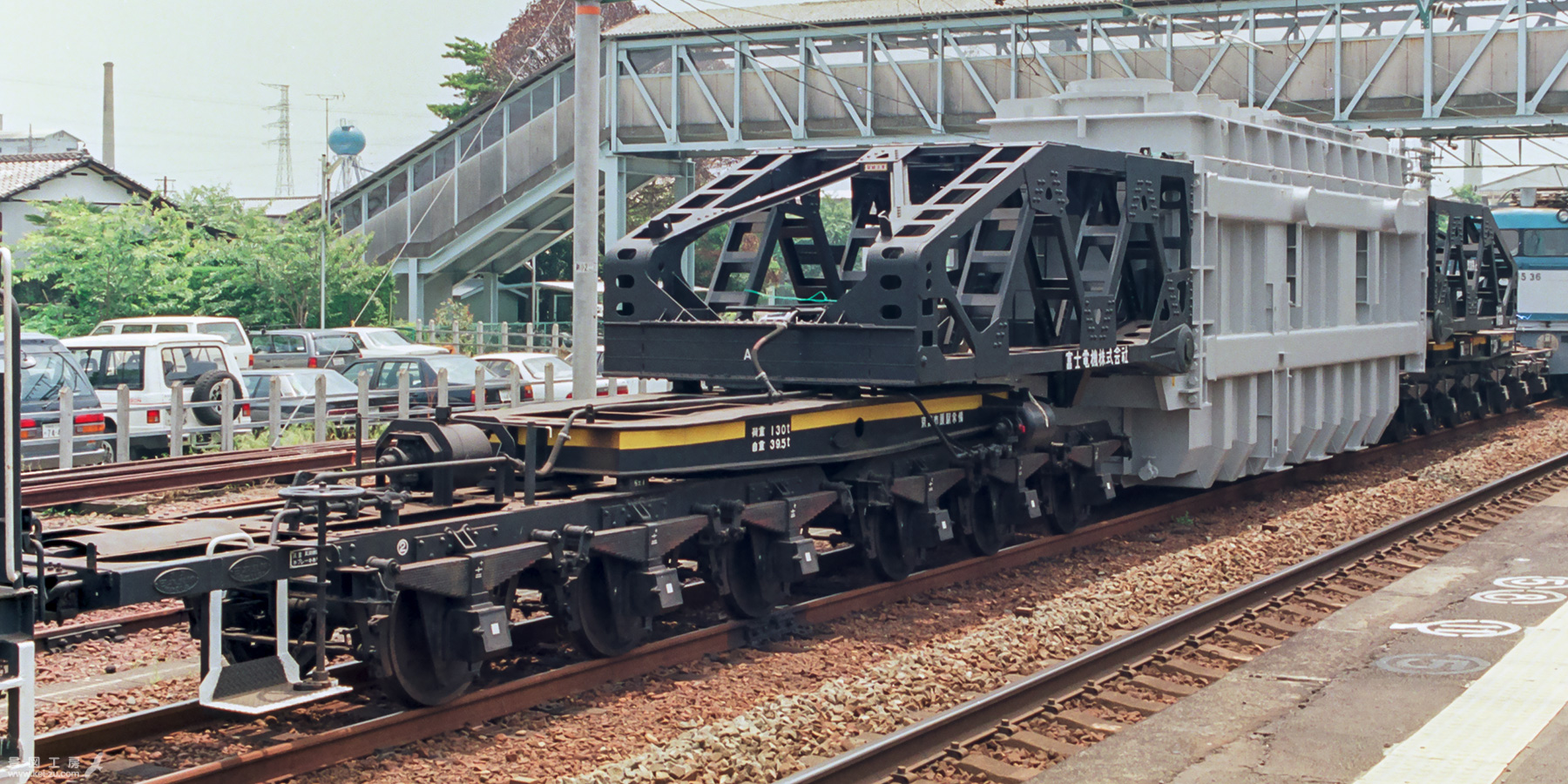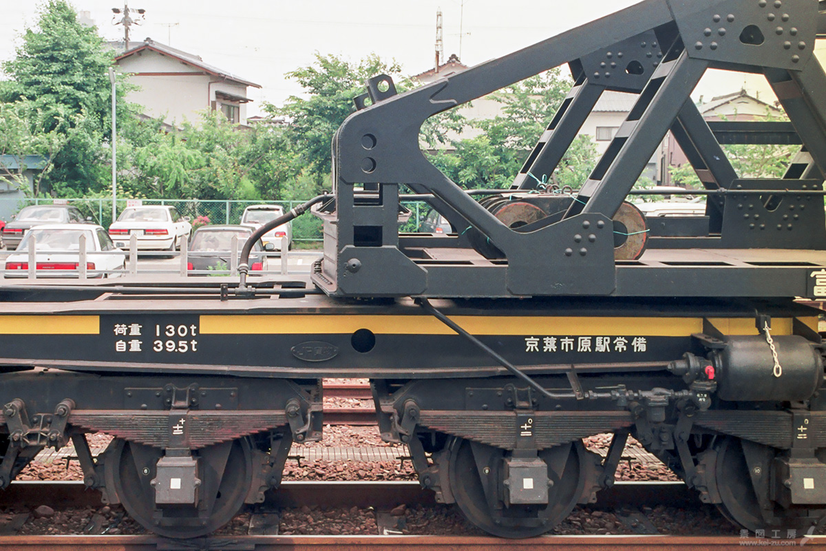 また、この位置から見ると荷下ろし時の荷受梁が独立できるよう、台車枠に仮置きする脚部が確認できる。