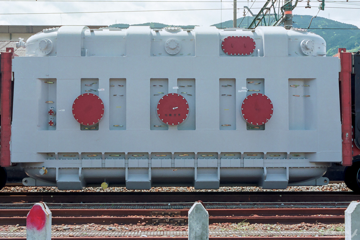 写真の白い構造体全部が変圧器本体で、この形のまま変電所に据え付けらる。両脇の赤茶色の部材は積荷の筐体と荷受梁を固定するための継ぎ手で、通常は一度きりの特注仕様である。
